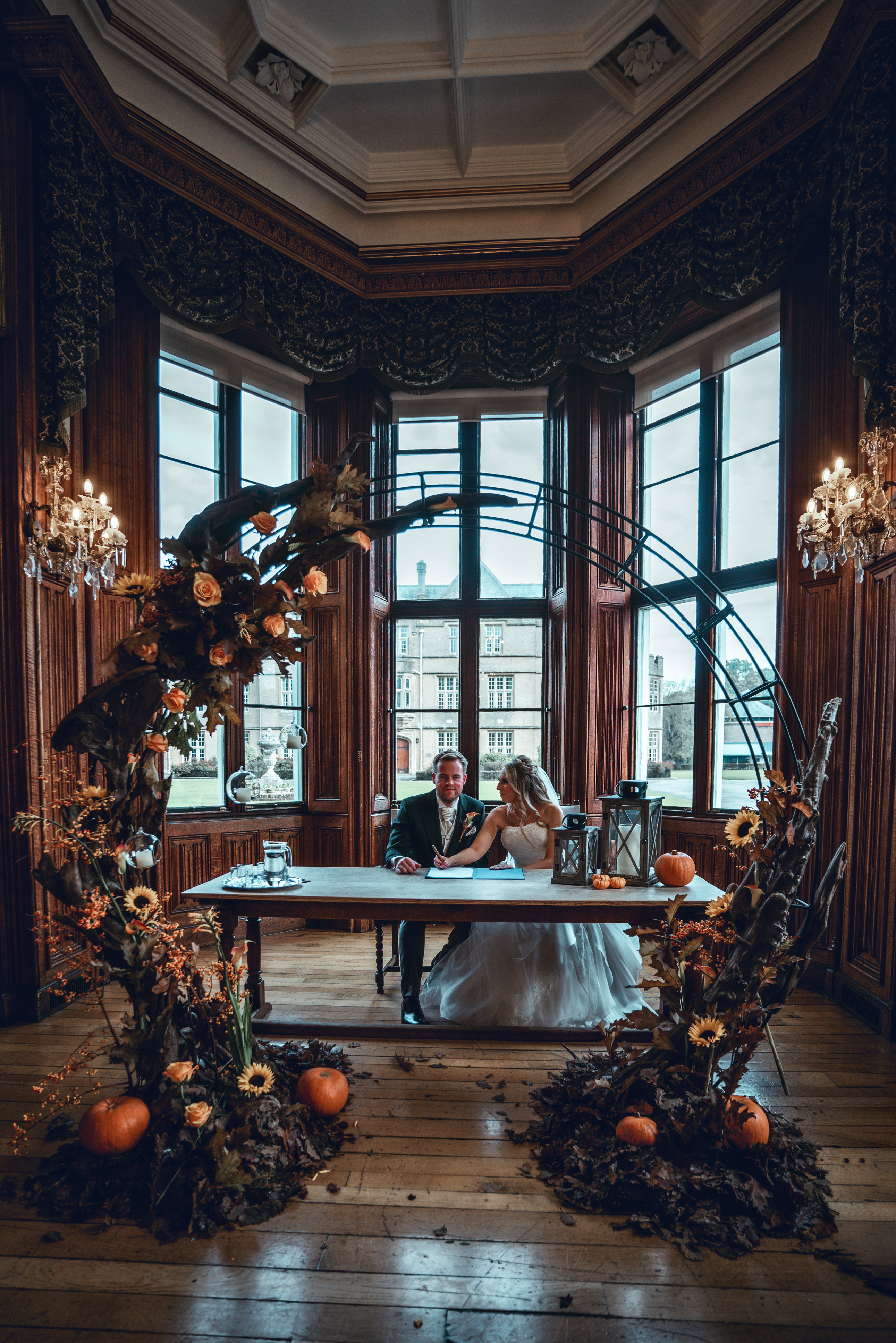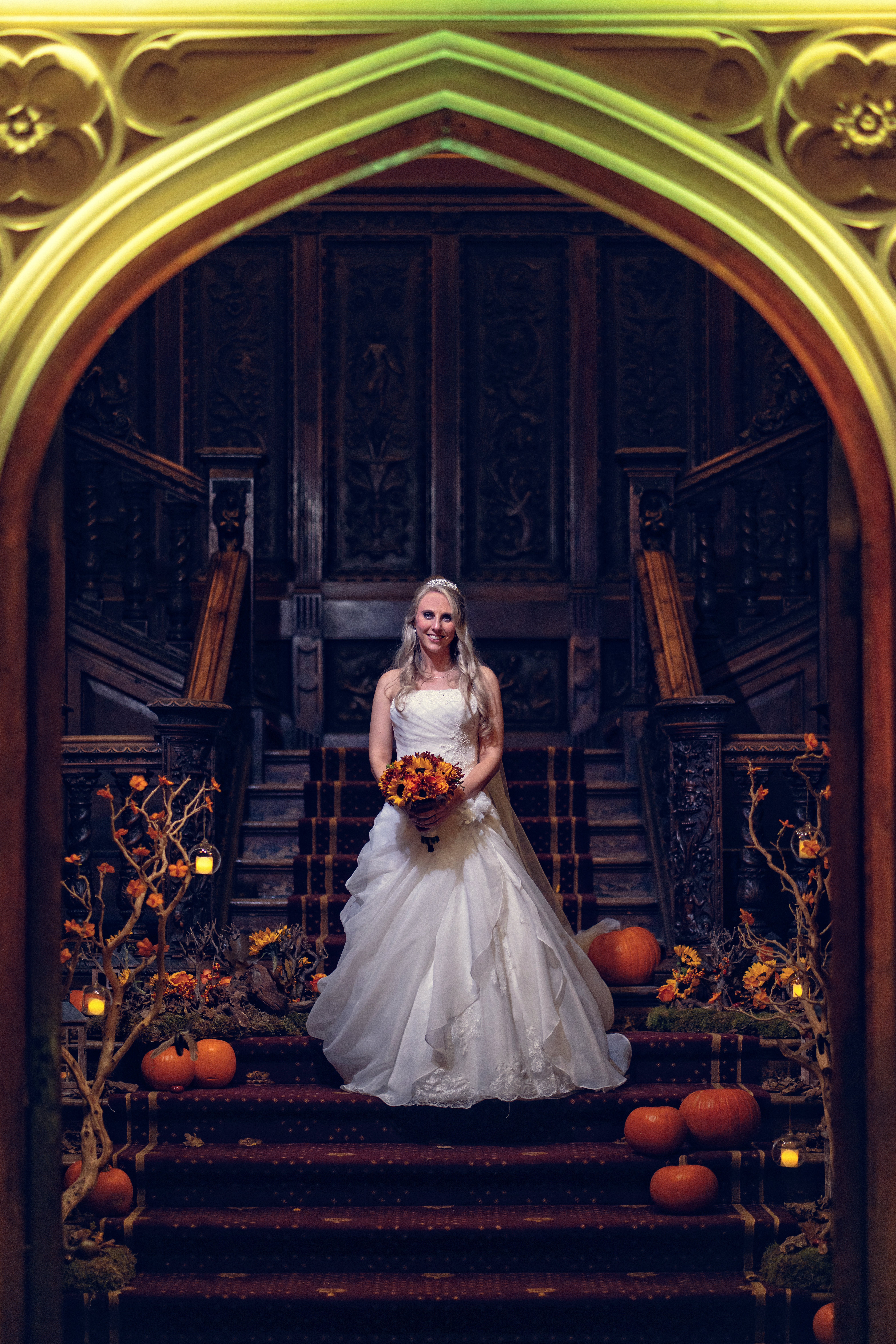 The prestigious Canford School in Wimborne, southwest England, presented a magical backdrop reminiscent of a big Hollywood production film set – in this case – a Harry Potter inspired set as the couple are huge fans of the books and films. Every detail was meticulous planned out and ably assisted by the ever-present Toastmaster Bob and the staff at the school, from hand-carved Pumpkins to a photobooth with real grass and lamp post and bench for a whimsical setting, to the dining hall adorned with hanging trees and candles. It was a wedding unlike any other and we were surprised everywhere we turned.