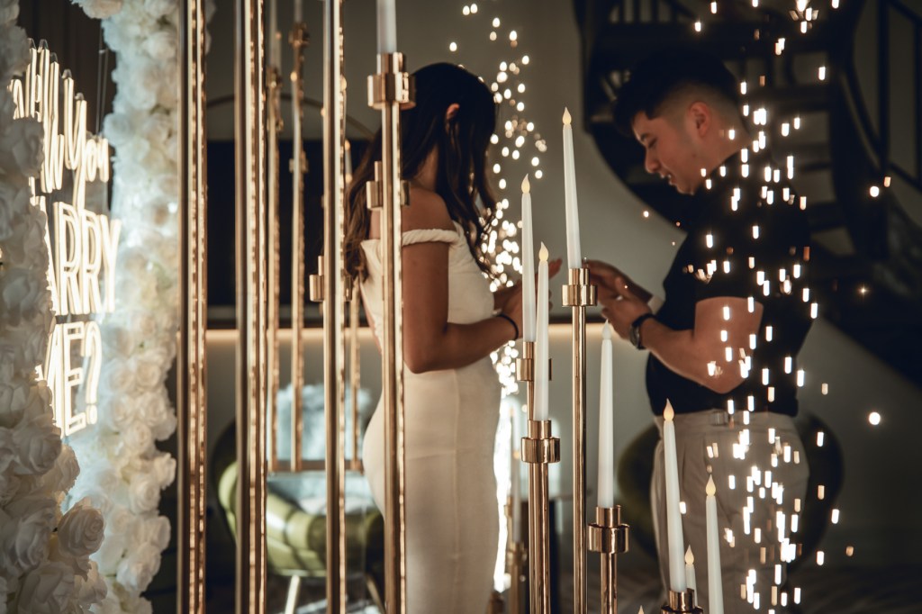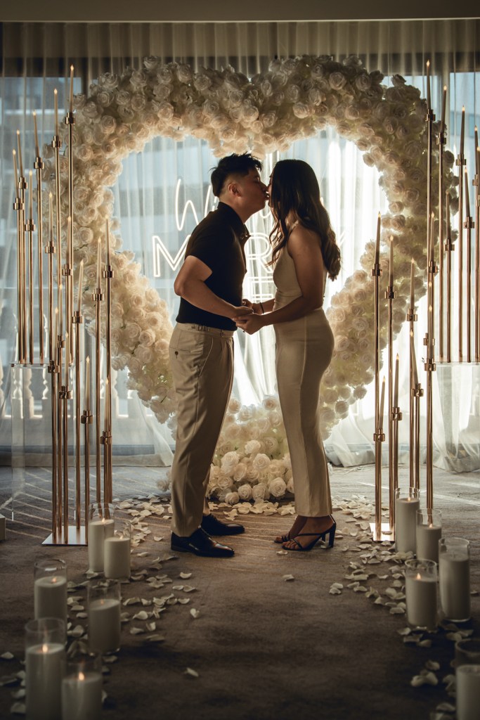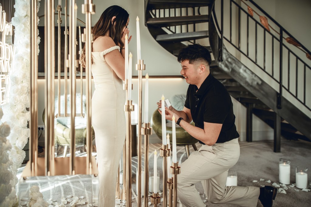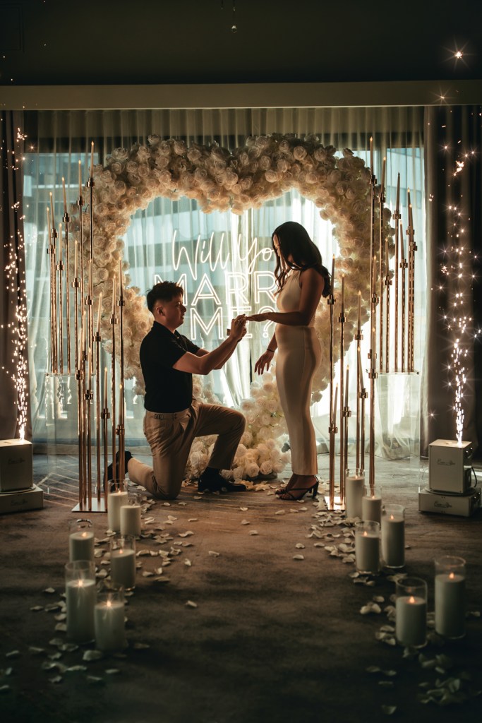 I hid behind the curtains, as Lyanne and Andy slowly walked into the hotel room at the Playford – into a beautiful WILL YOU MARRY ME set up in the centre of the room.